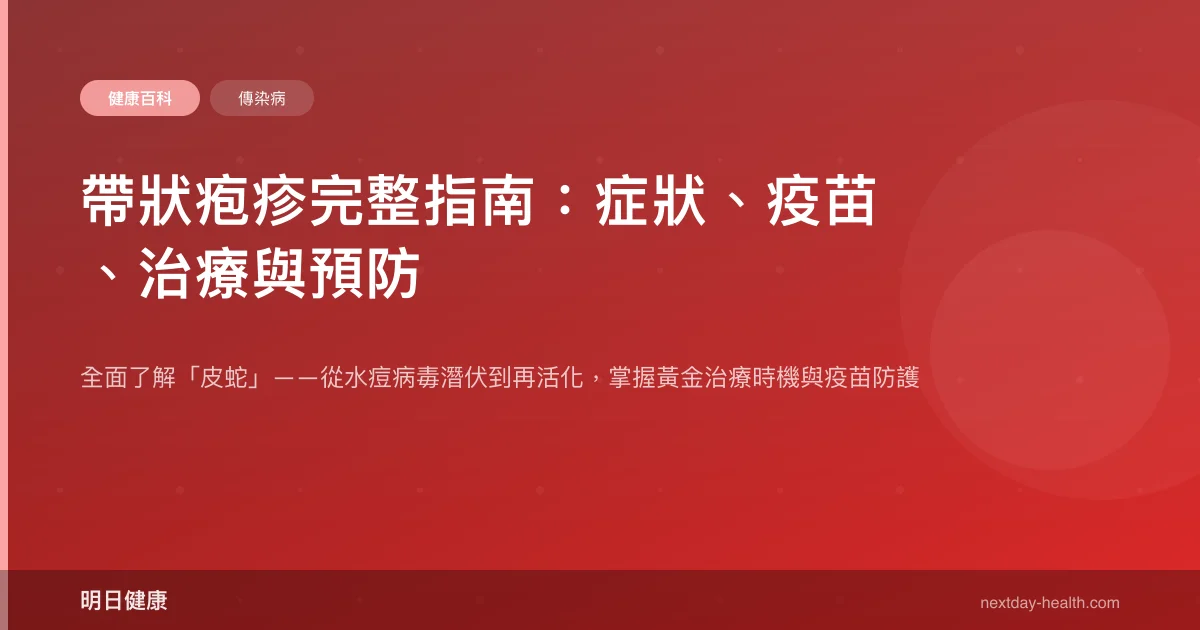 帶狀疱疹(Herpes Zoster),俗稱「皮蛇」或「蛇纏腰」,是水痘帶狀疱疹病毒(Varicella-Zoster Virus, VZV)再活化所引起的急性病毒感染。