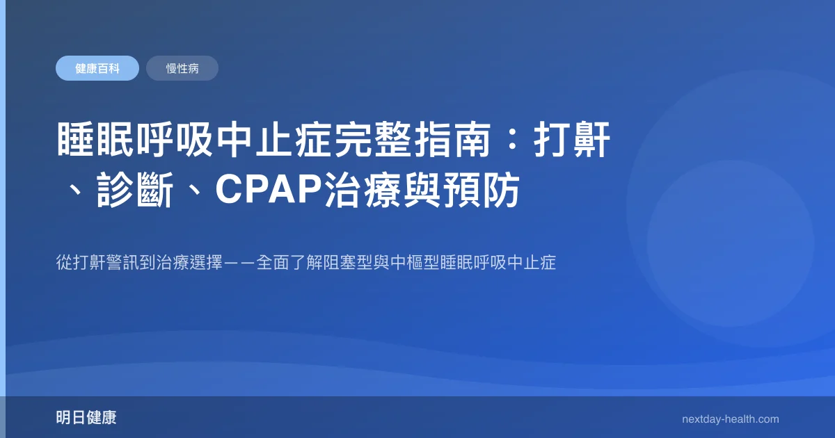 睡眠呼吸中止症(Sleep Apnea)是一種睡眠中反覆發生呼吸暫停或氣流明顯減少的疾病,導致間歇性缺氧和睡眠片段化,進而影響白天功能和長期健康。