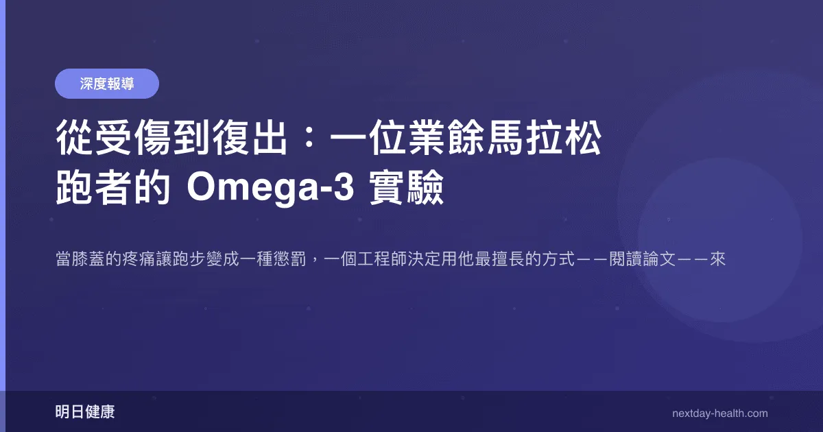 他現在的跑步習慣和受傷前有了明顯的不同:週跑量控制在 40-50 公里、每週至少兩天完全休息、每週吃三次以上的深海魚、持續服用中等劑量的魚油補充劑。他的下一個目標是今年秋天的太魯閣馬拉松——但這次,他不再追求成績。「跑步教會我最重要的一課不是關於速度或距離,而是關於發炎和修復的平衡。身體不是一台可以無限操的機器,它是一個需要被尊重的生態系統。」