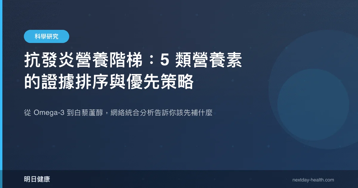 面對慢性發炎相關健康問題,營養介入的選擇愈來愈多,但各類補充品的證據強度落差極大。2024 年《英國醫學期刊》(BMJ)一篇涵蓋 218 項隨機對照試驗的網絡統合分析指出,運動對憂鬱症狀的效果量(SMD = −0.62)與藥物治療相當;同年,維生素 D 統合分析確認其對乾眼症發炎指標的改善;而薑黃素、白藜蘆醇與 Omega-3 的臨床資料則呈現「效果有亮點、限制也不少」的複雜圖景。本文以「階梯」思維,依據現有證據等級排序這五類介入手段,協助讀者理解優先順序。