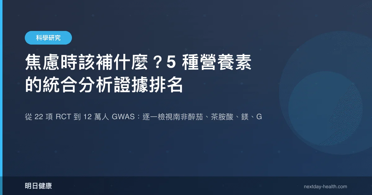 全球焦慮症盛行率持續攀升,許多人在藥物治療之外尋求營養補充策略。然而,市面上宣稱「抗焦慮」的營養素品項繁多,證據品質參差不齊。本文依據 2022–2026 年最新統合分析與大型研究,針對南非醉茄、L-茶胺酸、鎂、GABA 與 Omega-3 五種常見營養素,逐一解析其證據等級與適用情境,協助讀者釐清哪些有堅實臨床數據支撐,哪些則仍停留在機制推論階段。