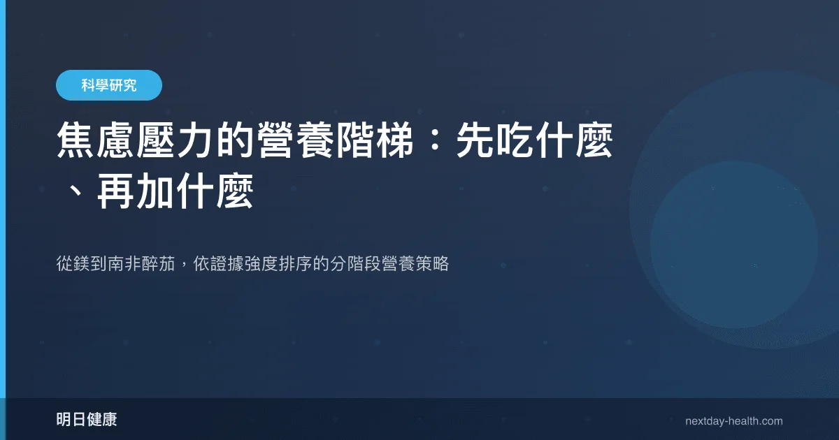 面對壓力與焦慮,多數人想到的第一步是「該補什麼」,但更關鍵的問題或許是「該先補什麼」。2026 年多項大型統合分析與基因體研究的發布,讓我們得以用證據等級重新排列營養補充的優先順序——從基礎飲食缺口的修補,到具臨床試驗支持的活性成分介入,形成一套「營養階梯」思維。本文整合六篇最新文獻,依研究設計強度與直接相關性,逐階解析五種與焦慮壓力相關的營養素。