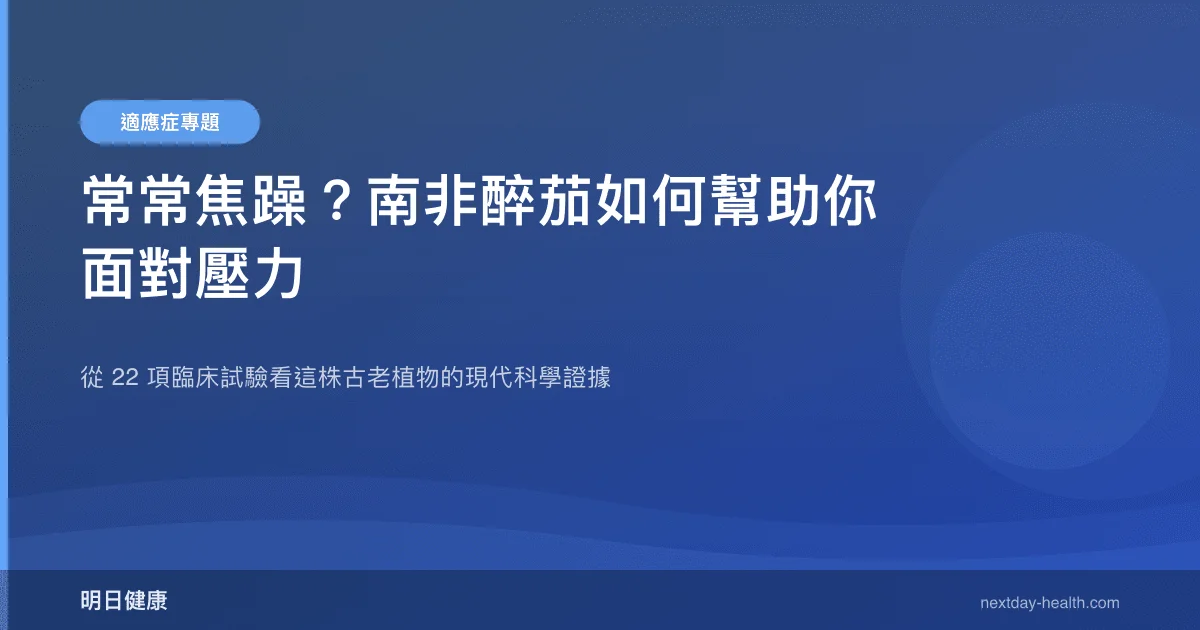 如果這個場景對你來說很熟悉,你不是少數。現代生活中的慢性壓力,往往不是一次性的打擊,而是日積月累的微小摩擦。近年來,一種名為南非醉茄(Ashwagandha,學名 Withania somnifera)的傳統草本植物,開始受到營養科學界的關注。它真的能幫上忙嗎?讓我們看看研究怎麼說。