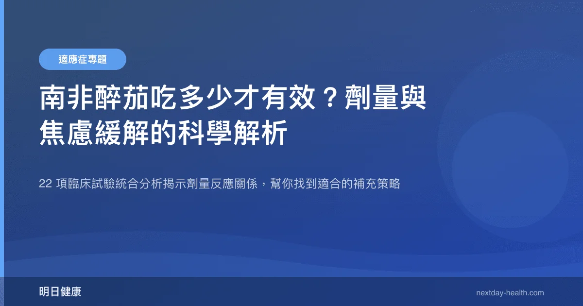 南非醉茄對焦慮和壓力的正面效果已獲得大規模統合分析支持。Alsanie 等人(2026)在《Complementary Therapies in Medicine》發表的系統性回顧,納入了 22 項隨機對照試驗,針對成人心理健康進行劑量反應統合分析。結果顯示,補充南非醉茄後,受試者的壓力、憂鬱與焦慮量表分數均顯著改善。