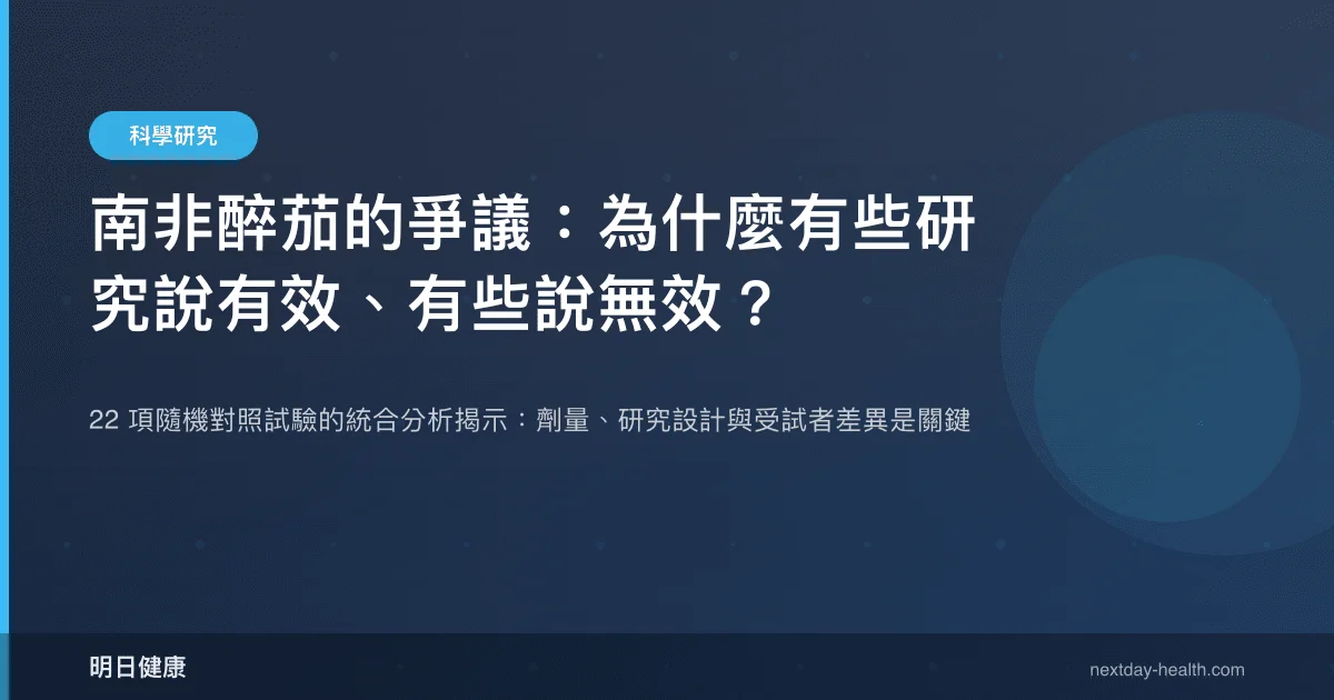 2026 年一篇納入 22 項隨機對照試驗的統合分析發現,南非醉茄對壓力、焦慮與憂鬱症狀均達統計顯著改善。研究同時揭示劑量與壓力減輕之間存在線性與非線性的劑量反應關係。然而,各試驗之間的異質性偏高,意味著不同研究的設計、劑量、萃取方式與受試者條件差異很大,這正是結果看似矛盾的主因。