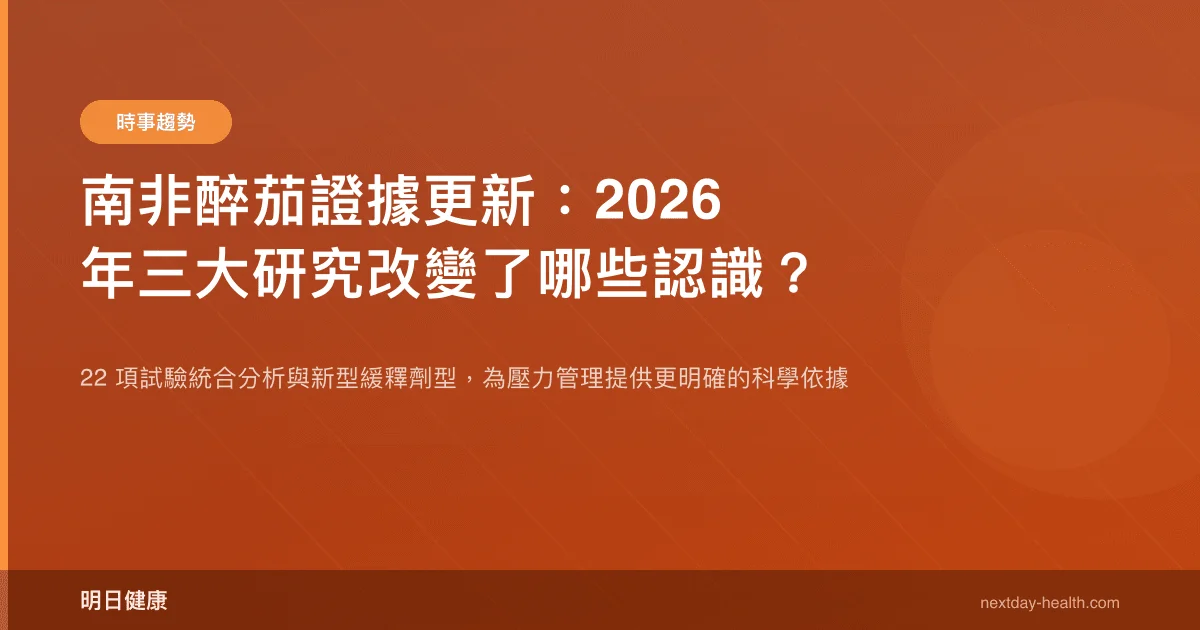 - 2026 年統合分析納入 22 項隨機對照試驗,確認南非醉茄可顯著改善壓力、焦慮與憂鬱症狀(Alsanie et al., PMID: 41644067)