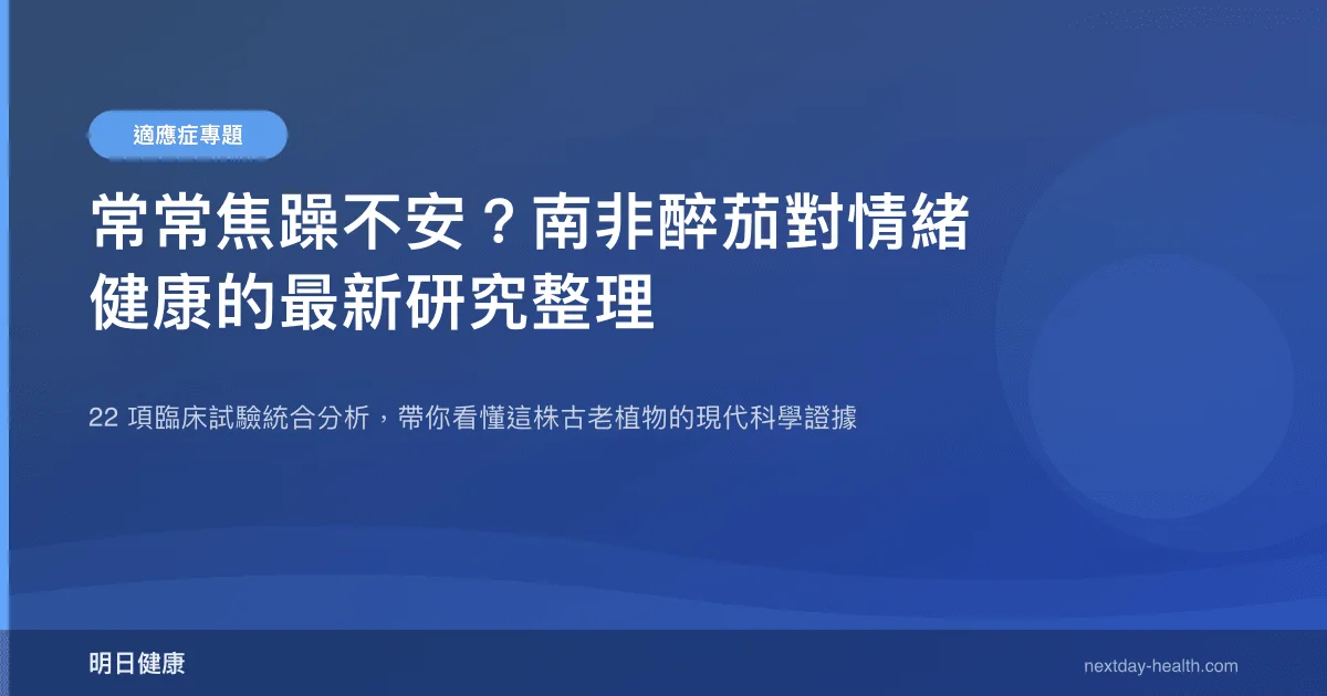 - 22 項隨機對照試驗統合分析顯示,南非醉茄顯著改善壓力、焦慮與憂鬱症狀(PMID: 41644067)