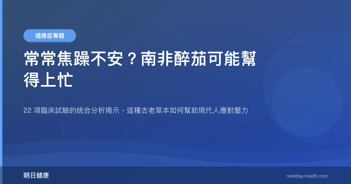 - 22 項隨機對照試驗統合分析證實,南非醉茄能顯著改善壓力、焦慮與憂鬱症狀(Alsanie et al., 2026)