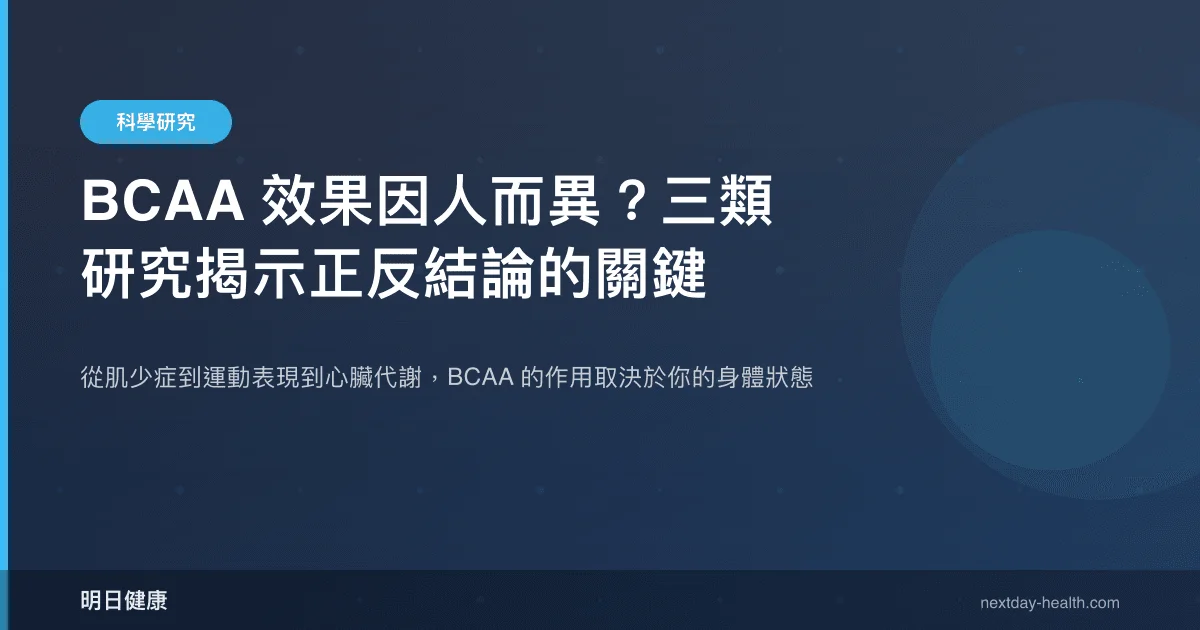 BCAA(支鏈胺基酸)是指白胺酸、異白胺酸與纈胺酸三種人體無法自行合成的必需胺基酸,廣泛存在於肉類、乳製品與豆類中。近年 BCAA 補充劑在健身與銀髮族市場極為熱門,但研究結果卻經常「互相打架」——有些顯示明確好處,有些卻指向潛在風險。2025-2026 年三篇不同領域的研究,恰好呈現了這個矛盾的全貌。