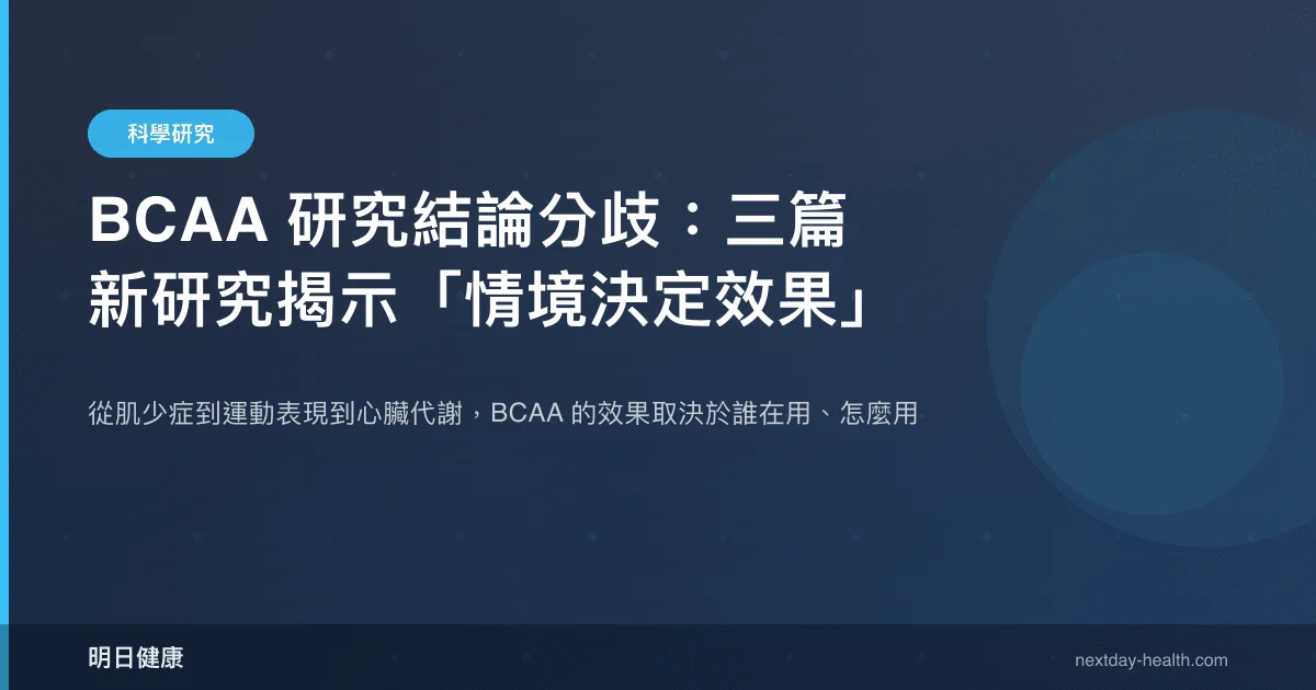 BCAA(支鏈胺基酸)是指白胺酸、異白胺酸與纈胺酸三種人體無法自行合成的必需胺基酸。近年圍繞 BCAA 的研究結論經常互相矛盾——有的說能增肌、有的說沒差、有的甚至暗示可能傷心臟。2025-2026 年發表的三篇研究,恰好分別代表三種不同情境,有助於理解這場爭論的本質。