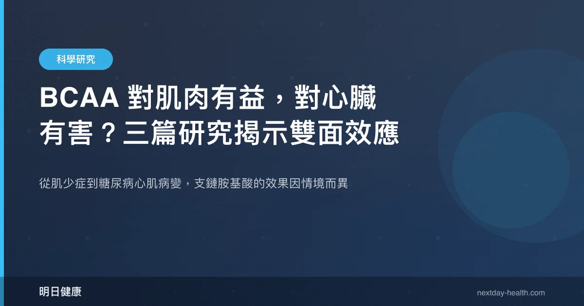 支鏈胺基酸(BCAA)是指白胺酸、異白胺酸與纈胺酸三種人體無法自行合成的必需胺基酸。近年 BCAA 補充品在健身市場熱賣,但科學文獻呈現矛盾訊號——有些研究顯示增肌效果顯著,有些卻指向心臟代謝風險。2025-2026 年三篇研究從不同角度拆解了這道矛盾。