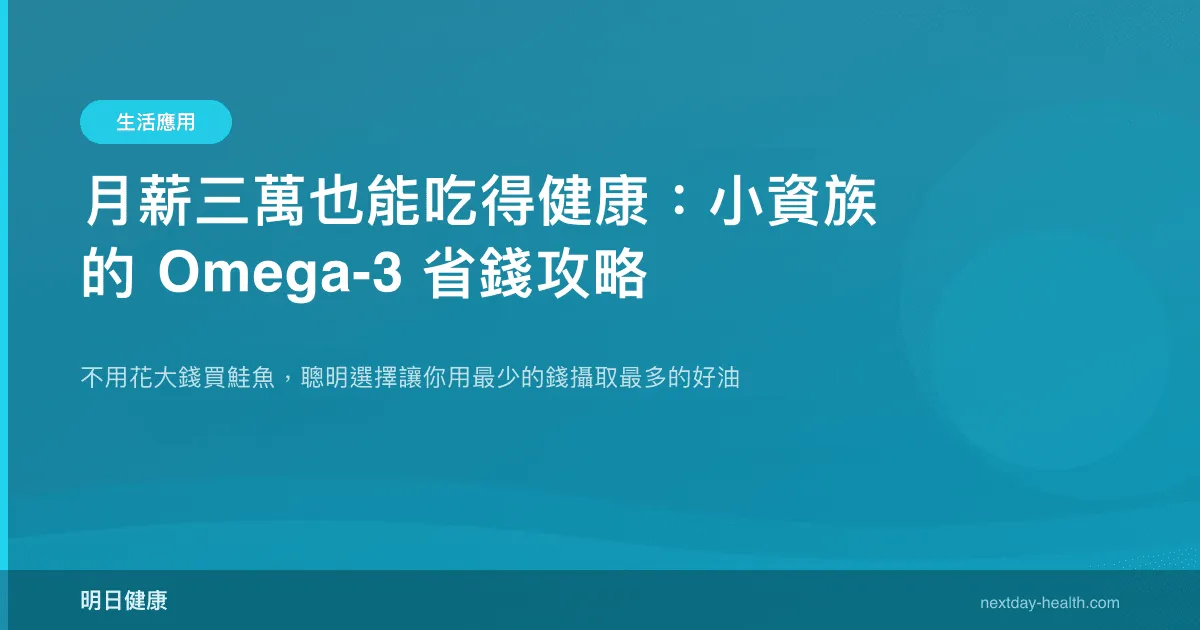 月薪三萬不代表你的健康也要打折。Omega-3 的來源很多,鮭魚只是其中最被行銷推廣的一種。鯖魚、秋刀魚、沙丁魚——這些「平民魚」的 Omega-3 含量一點都不輸鮭魚,價格卻只有它的零頭。吃得聰明,比吃得貴更重要。