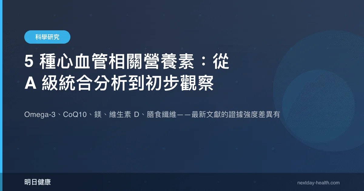 心血管疾病仍是全球首要死因,營養補充被視為藥物治療之外的潛在輔助策略。然而,不同營養素的臨床證據強度差異極大——從 A 級統合分析到觀察性初步發現,跨度可達數個等級。本文彙整 2024–2026 年五項最新研究,涵蓋 Omega-3、CoQ10、鎂、維生素 D 及膳食纖維,逐一拆解其證據等級與適用邊界,協助讀者建立「分級思維」。