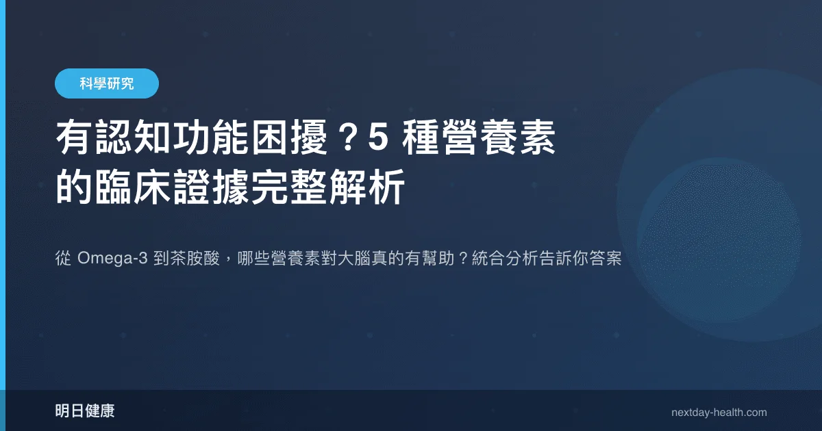認知功能是指大腦進行記憶、注意力、推理與決策等高階運作的能力。隨著年齡增長,神經細胞的突觸傳導效率降低、氧化壓力累積,加上慢性低度發炎,都可能導致認知表現逐步下滑。近年統合分析顯示,特定營養素的補充可從不同機轉支持腦部功能——但並非每一種都有同等強度的證據。本文整理 Omega-3、L-茶胺酸、鎂、維生素 B 群與維生素 D 等五種常見營養素的臨床數據,幫助讀者判斷哪些值得關注。