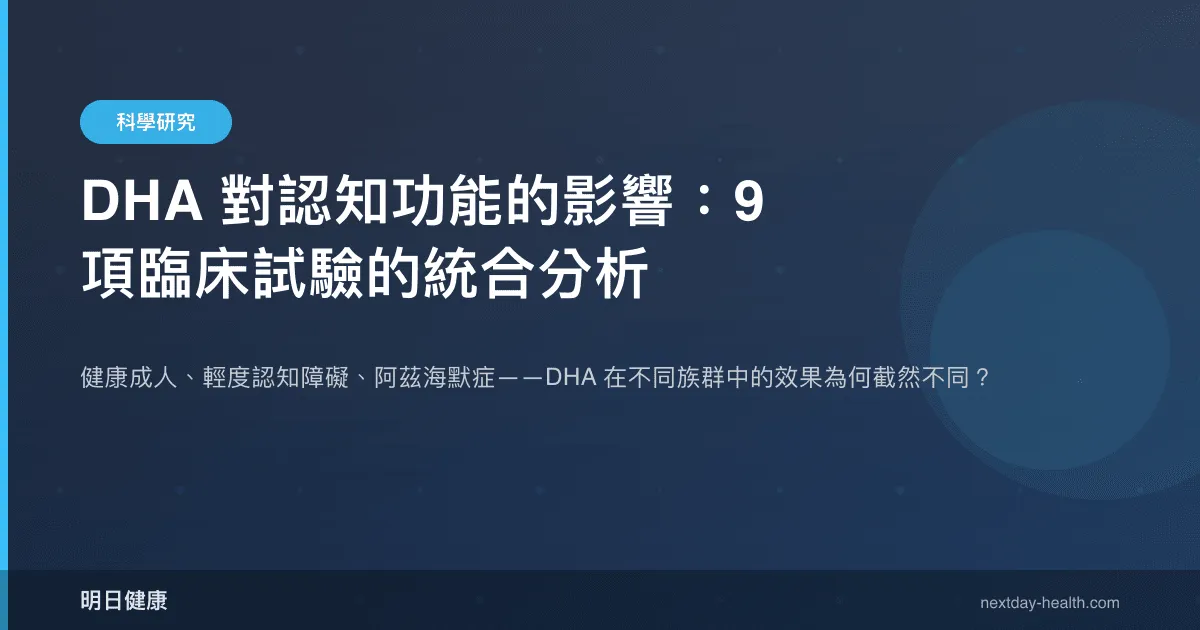 DHA(二十二碳六烯酸)是大腦灰質中含量最豐富的 Omega-3 脂肪酸,約佔腦部脂肪酸總量的 40%。Dighriri 等人於 2022 年在《Cureus》期刊發表的統合分析(PMID: 36381743),系統性地彙整了 9 項隨機對照試驗(RCT)、共計 1,319 名受試者的數據,評估 DHA 對不同認知狀態族群的影響。