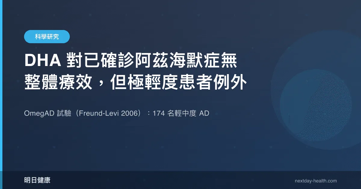 阿茲海默症(Alzheimer's disease, AD)是最常見的退化性失智症,目前尚無能逆轉或完全阻止病程進展的藥物。基於流行病學研究中魚類攝取與失智風險的負相關觀察,以及 DHA 作為大腦皮質主要結構性脂肪酸的生物學基礎,多個研究團隊嘗試以 Omega-3 脂肪酸補充作為 AD 的輔助治療策略。Freund-Levi 等人於 2006 年在《Archives of Neurology》發表的 OmegAD 試驗(PMID: 17030655),是首批針對已確診 AD 患者進行的大型隨機對照試驗之一,其結果對臨床實踐與研究方向均產生了深遠影響。