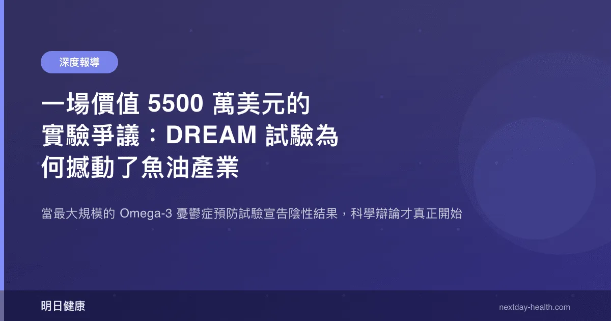 2018 年 6 月的一個早晨,全球魚油補充劑產業的高層主管們打開了最新一期的《JAMA》期刊,然後陷入了沉默。一項名為 DREAM(Depression Research: EPA Management)的大型隨機對照試驗結果正式發表(PMID: 29652551),宣告了一個他們最不願意看到的結論:在接受干擾素-α(interferon-alpha)治療的 C 型肝炎患者中,預防性補充 EPA 未能顯著降低重度憂鬱症的發生率。對於一個年營業額超過數十億美元的全球魚油市場而言,這無疑是一記沉重的打擊。但對於科學界而言,真正的故事——關於實驗設計、安慰劑選擇、以及陰性結果的意義——才剛剛開始。