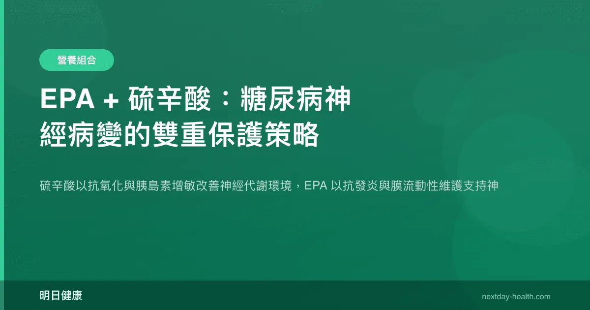 糖尿病周邊神經病變(diabetic peripheral neuropathy, DPN)影響約 50% 的糖尿病患者,是導致足部潰瘍、截肢與生活品質嚴重下降的主要原因。其病理機制涉及高血糖引發的氧化壓力、多元醇路徑活化、晚期糖化終產物(AGEs)累積與慢性低度發炎的交互作用。α-硫辛酸(alpha-lipoic acid, ALA)與 EPA(二十碳五烯酸)分別靶向氧化壓力與發炎這兩大核心病理軸線,為 DPN 的營養輔助策略提供了理論基礎。