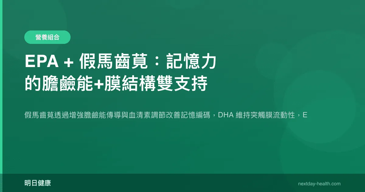 假馬齒莧與 EPA/DHA 的協同可以從「神經傳導效率的串聯優化」角度來理解。認知功能——特別是記憶的編碼與提取——涉及以下連續步驟:突觸前神經傳導物質的釋放(受膜流動性影響)→突觸間隙的訊號持續時間(受 AChE 活性影響)→突觸後受體的訊號轉導(受膜微域組織影響)→長期增益效應(LTP)的建立(受發炎狀態影響)。DHA 優化第一步(膜流動性促進囊泡融合),假馬齒莧增強第二步(AChE 抑制延長 ACh 作用),DHA 再次參與第三步(膜微域組織優化受體功能),EPA 保障第四步(消退神經發炎以維護 LTP)。