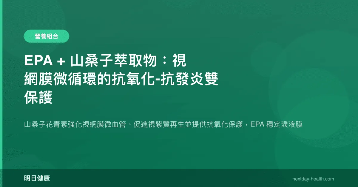 山桑子花青素與 EPA 在視網膜微循環保護上形成了高度互補的協同結構。微循環健康的維持需要同時解決兩個問題:血管結構的完整性(防止滲漏與出血)與血管環境的穩態(控制發炎與氧化壓力)。花青素主要解決前者——透過膠原蛋白交聯強化基底膜、抑制 MMP 降解基底膜、降低血管通透性;EPA 主要解決後者——透過消退素系統消解血管發炎、降低白血球黏附、維護 BRB 的功能性完整。