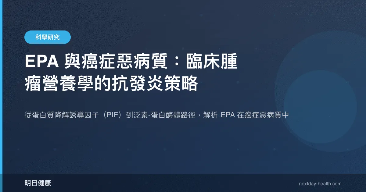 癌症惡病質(cancer cachexia)是一種以進行性骨骼肌消耗為核心特徵的多因子代謝症候群,影響約 50-80% 的晚期癌症患者,並直接導致約 20-30% 的癌症相關死亡(Fearon et al., 2011, PMID: 21296615)。與單純的營養不良不同,惡病質的肌肉流失無法完全透過增加熱量攝取來逆轉——其本質是一種由腫瘤與宿主交互作用驅動的系統性發炎-代謝失調狀態。在此病理框架下,二十碳五烯酸(Eicosapentaenoic Acid, EPA, C20:5n-3)作為一種具有多重抗發炎靶點的 Omega-3 脂肪酸,在臨床腫瘤營養學中受到了廣泛的研究關注。