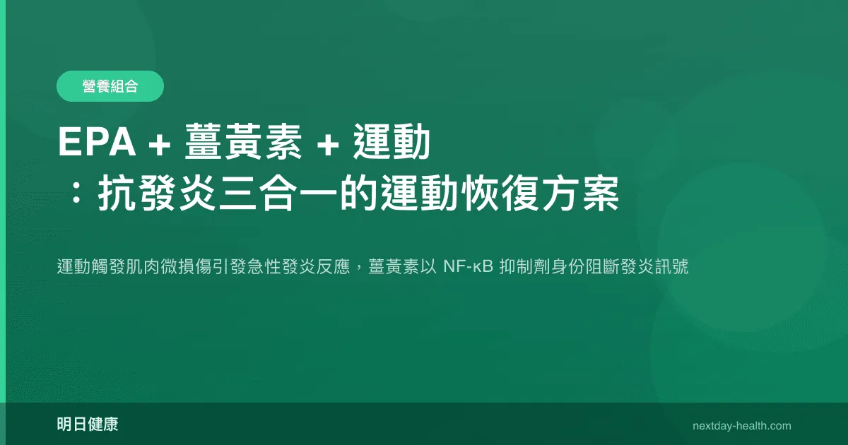 運動——特別是涉及離心收縮(eccentric contraction)的阻力訓練或高強度間歇訓練——不可避免地造成肌纖維的微觀結構損傷,觸發一系列發炎與修復反應。延遲性肌肉痠痛(delayed onset muscle soreness, DOMS)是這一過程的主觀體驗表徵,通常在運動後 24-72 小時達到峰值。雖然適度的發炎反應是肌肉適應與重塑的必要前提,但過度或延遲消退的發炎會導致恢復時間延長、後續訓練品質下降、甚至累積性的過度訓練風險。薑黃素(curcumin)與 EPA 分別從發炎訊號的不同層級進行調控,其聯合使用在運動恢復的語境中展現了機制互補的協同潛力。本文從運動免疫學與分子藥理學的交叉角度,解析此一「抗發炎三合一」策略的科學基礎。