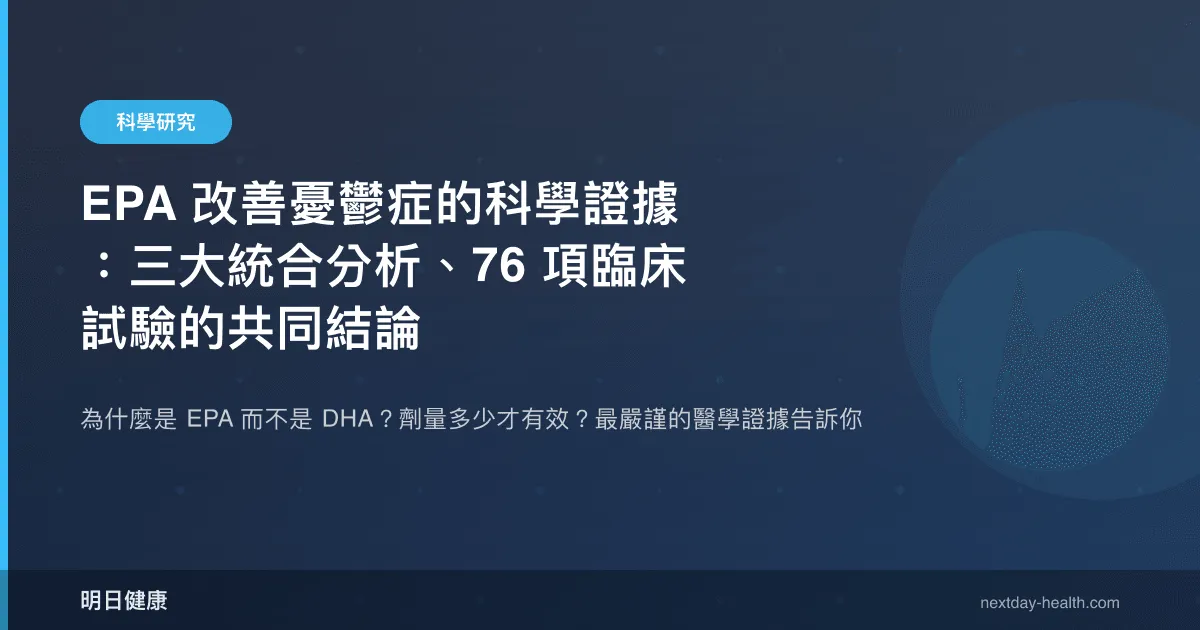 在營養精神醫學領域,EPA(二十碳五烯酸)對憂鬱症的改善效果,是目前證據等級最高的發現之一。三篇獨立的統合分析——涵蓋 76 項隨機對照試驗、超過 5,000 名受試者——得出了高度一致的結論:EPA 是 Omega-3 脂肪酸中對情緒具有顯著改善效果的關鍵成分。