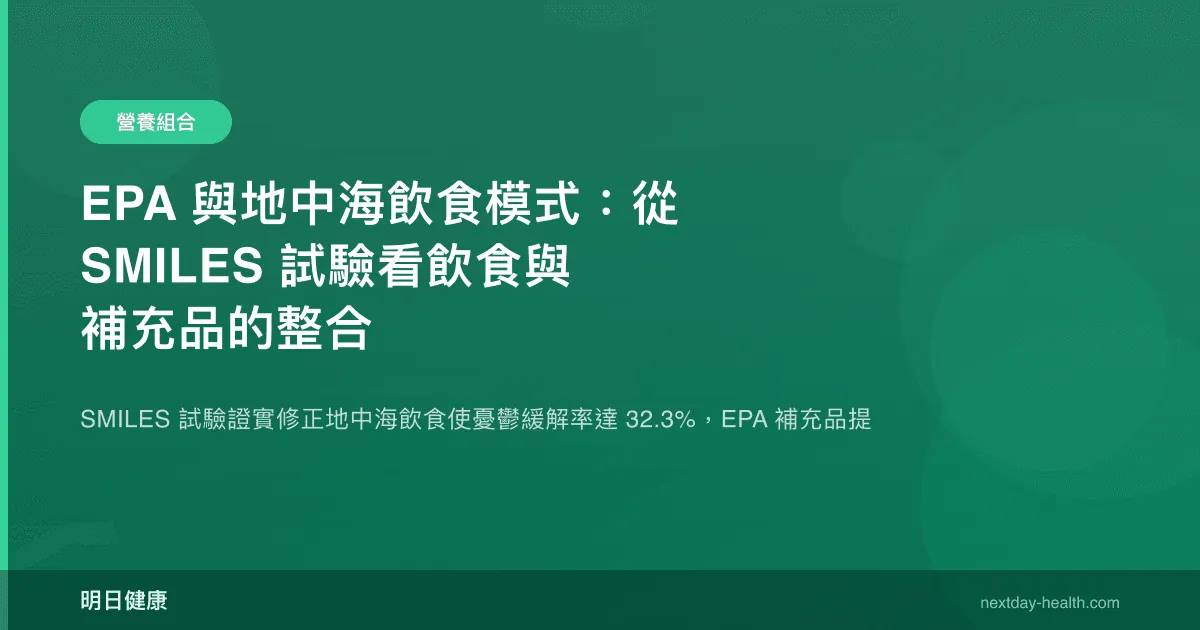 SMILES 試驗的設計無法分離個別營養素的貢獻,因為飲食介入是作為完整模式進行的。然而,該試驗的次要分析提供了一些線索。Parletta 等人 2019 年發表的 HELFIMED 試驗(PMID: 30720499)是一項隨機對照試驗,比較地中海飲食 + 魚油補充品(每日約 900 mg EPA + 630 mg DHA)與社會團體對照對憂鬱症狀的影響。結果顯示,飲食 + 魚油組在 6 個月後的憂鬱評分改善幅度顯著大於對照組,且紅血球膜 Omega-3 指數的增加與憂鬱評分改善呈正相關。