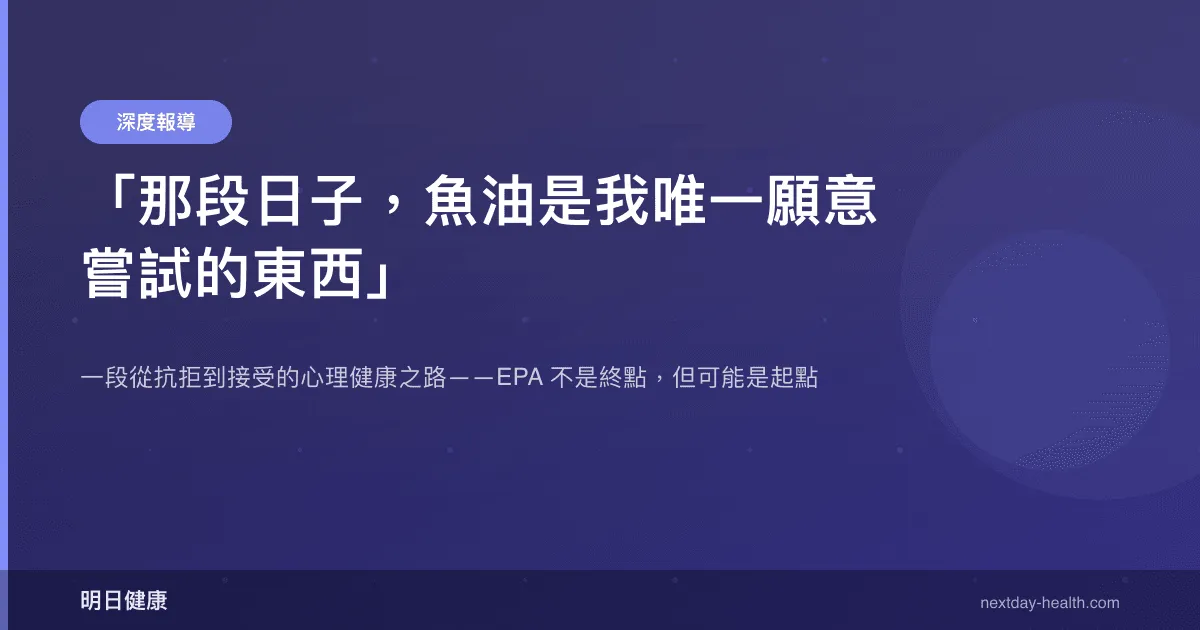 那天晚上回到家,我在瀏覽網頁時偶然看到一篇關於 EPA 與憂鬱症的統合分析摘要。文章引用了一項 2019 年發表在《Translational Psychiatry》的研究,指出 EPA 為主的 Omega-3 配方在輕度至中度憂鬱症的輔助治療中顯示出統計顯著的改善效果,特別是在具有較高基線發炎指標的患者中。我不知道自己的發炎指標如何,但這篇文章讓我停下來的原因不是它的科學結論,而是它提供了一個我心理上能接受的「入口」——吃一顆魚油膠囊,不需要處方箋,不需要走進診所,不需要對任何人承認任何事。