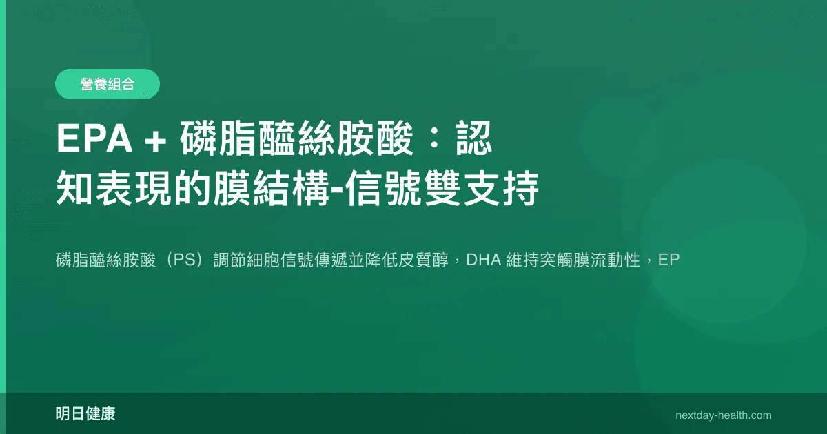 大腦是人體脂質含量最高的器官(乾重的 60% 為脂質),其認知功能的維持高度依賴細胞膜的結構完整性與信號傳遞效率。磷脂醯絲胺酸(phosphatidylserine, PS)作為神經元膜內葉(inner leaflet)的主要磷脂,與 DHA(二十二碳六烯酸)共同決定了突觸膜的物理化學性質;而 EPA(二十碳五烯酸)則從抗神經發炎的功能層面提供保護。這三者的結合構成了認知支持的「結構-功能」雙支柱策略——PS 與 DHA 負責「硬體」(膜結構),EPA 負責「環境」(降低神經發炎的干擾)。
