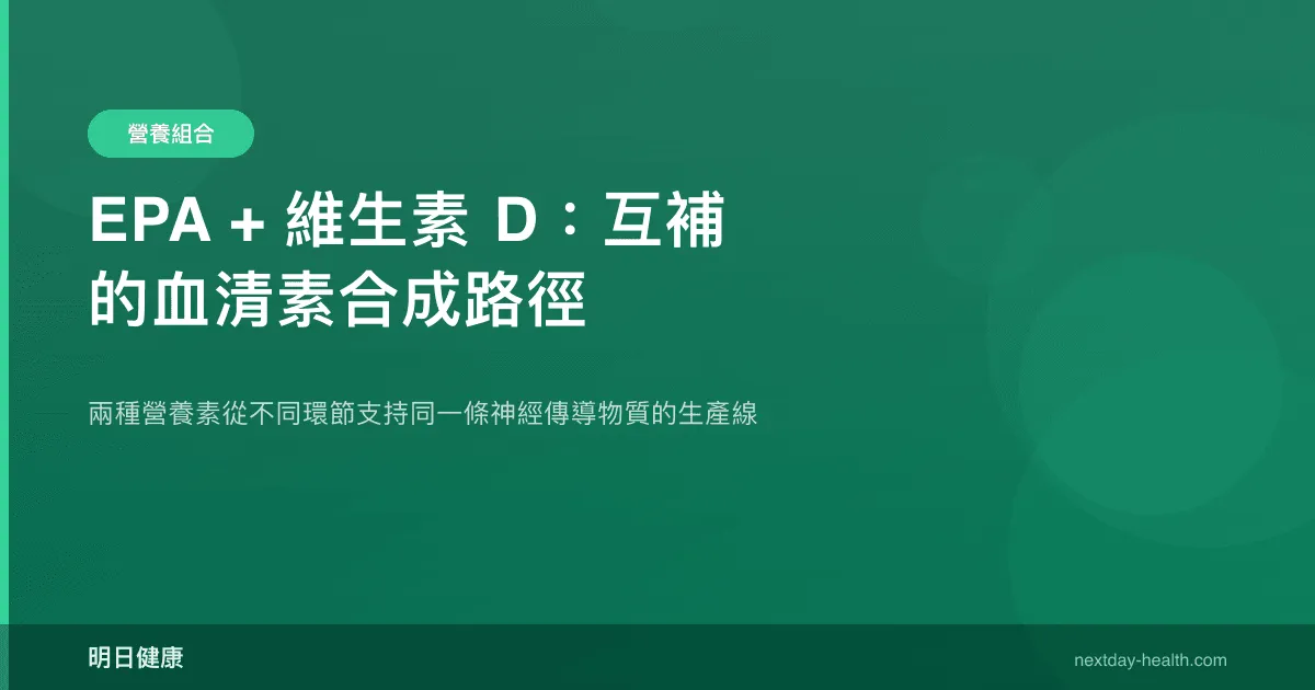 維生素 D 解決「產量」問題,EPA 解決「效率」和「保護」問題。兩者針對同一條路徑的不同瓶頸,構成非冗餘的互補。
