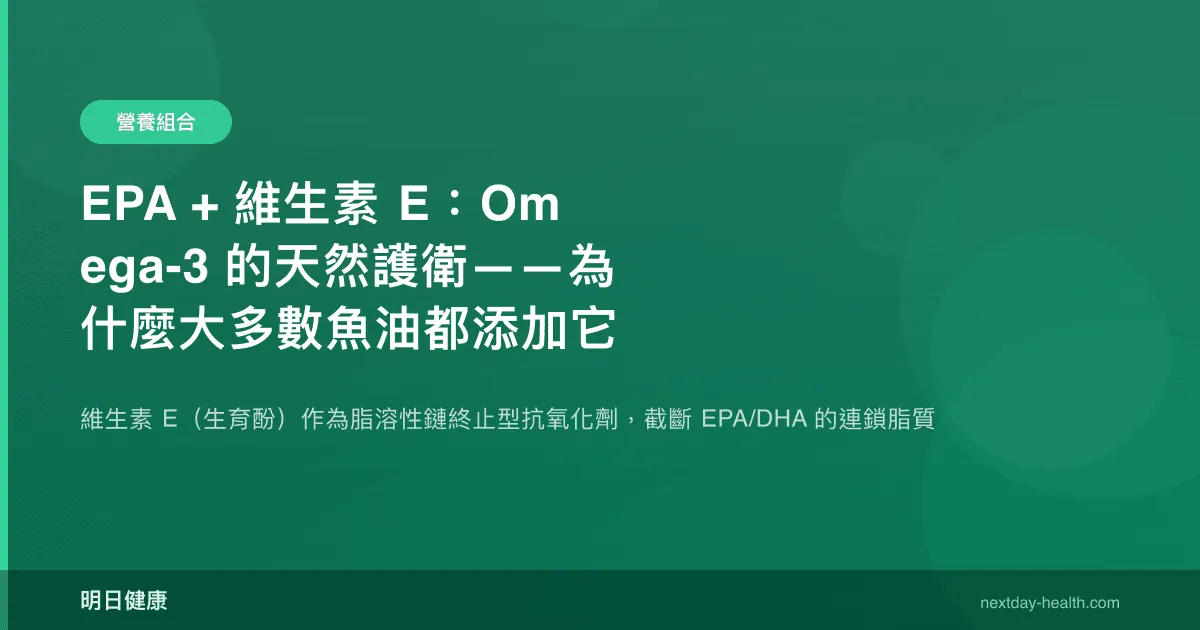 打開任何一瓶商業魚油膠囊的成分標示,幾乎都能在其中找到一項看似與 Omega-3 無關的成分——維生素 E(通常標示為 d-alpha-tocopherol 或 mixed tocopherols)。這一「標配」並非行銷策略,而是基於堅實的脂質化學原理:EPA(二十碳五烯酸)分子中的 5 個順式雙鍵使其成為極易氧化的脂肪酸,若缺乏適當的抗氧化保護,EPA 在儲存過程中與攝入人體後都可能遭受脂質過氧化(lipid peroxidation),不僅失去生物活性,更產生具有細胞毒性的氧化副產物。維生素 E 作為自然界中最重要的脂溶性鏈終止型抗氧化劑(chain-breaking antioxidant),恰好能在脂質環境中為 EPA/DHA 提供精準的保護。本文從脂質化學與營養生化學角度,系統解析這一經典組合的科學邏輯。