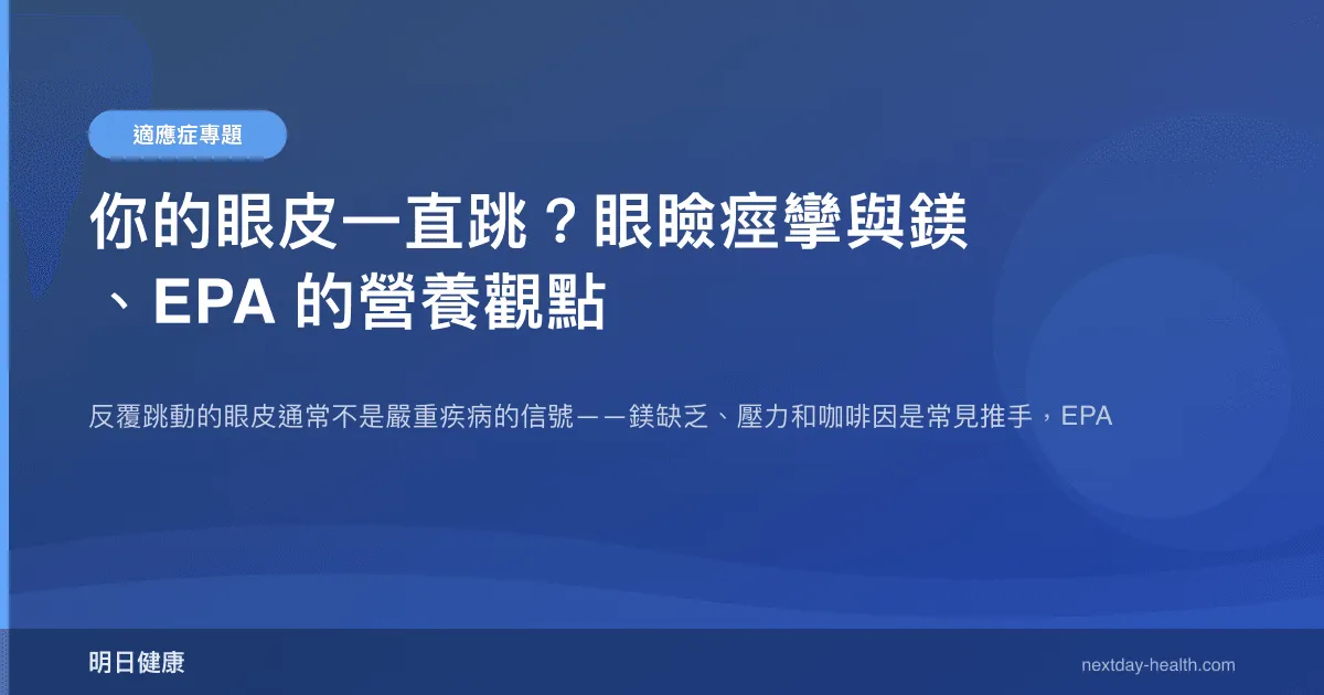 對於偶爾的眼皮跳動,鎂 + 休息 + 減少咖啡因通常就夠了。但如果眼皮跳動持續超過 2-3 週且對上述措施反應不佳,可能需要考慮是否有潛在的低度發炎因素。