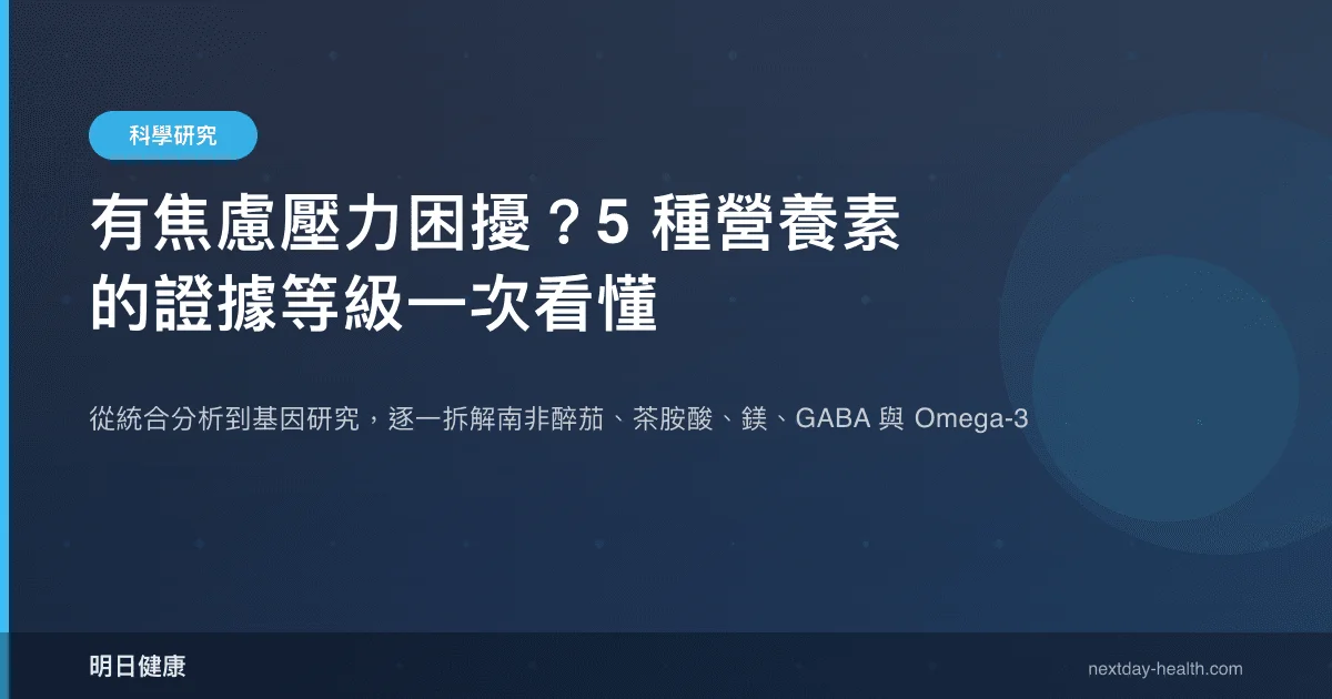 面對焦慮與壓力,坊間推薦的營養補充品琳瑯滿目,但並非每種都有同等強度的科學證據。證據等級是指依據研究設計的嚴謹程度,對研究結果可靠性進行的分層評估——統合分析(meta-analysis)位於頂端,其次為隨機對照試驗(RCT),再其次為觀察性研究與基因體學研究。本文根據 2022–2026 年的最新文獻,逐一檢視南非醉茄、L-茶胺酸、GABA、鎂與 Omega-3 這五種常見營養素在焦慮壓力領域的真實證據強度。