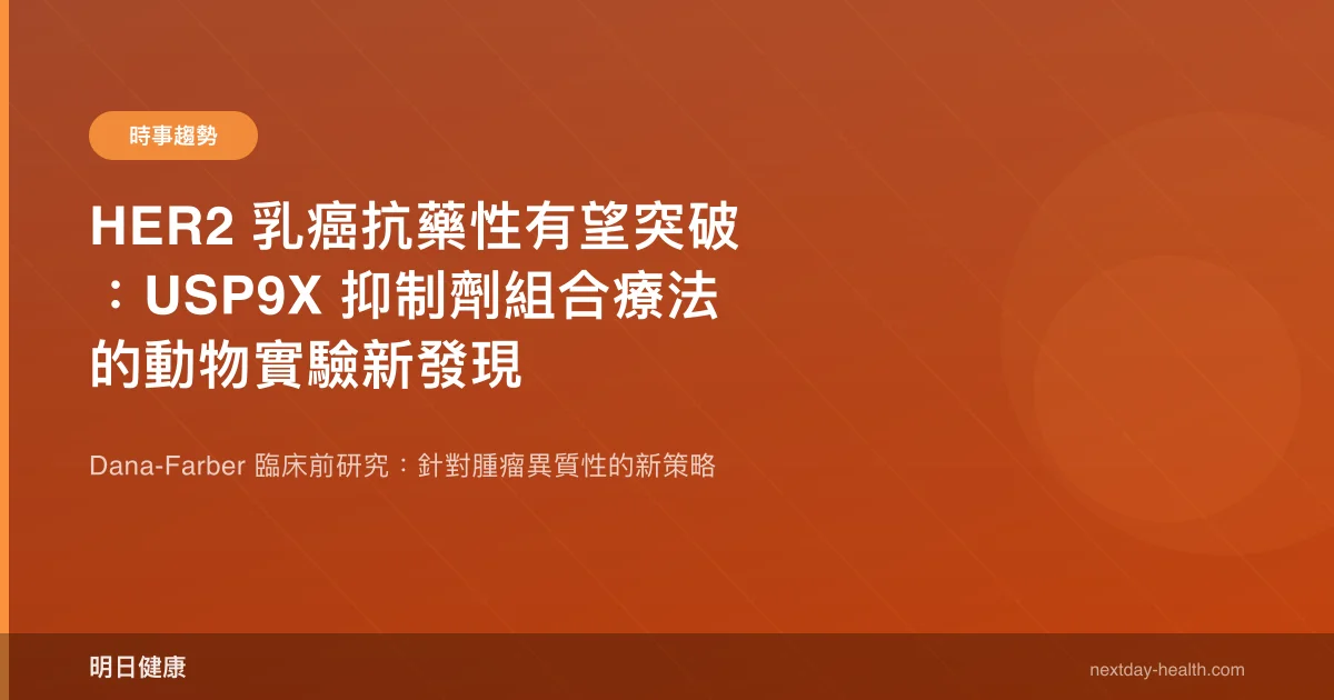 Dana-Farber 癌症研究所發表於《Cancer Discovery》的臨床前研究發現,USP9X 抑制劑與 T-DXd(trastuzumab deruxtecan)的組合療法,在動物模型中有效抑制了具有 HER2 異質性的乳癌腫瘤生長,並延長了無復發存活期。這項動物實驗結果為克服 HER2 標靶治療抗藥性提供了新方向。