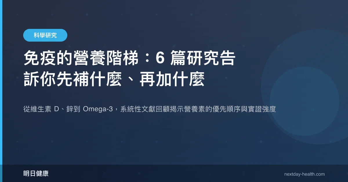 維生素 D、鋅、維生素 C、Omega-3 與規律運動——這五項元素常被並列為「免疫支持」的基本配置,但它們的實證強度並不相同。營養階梯(Nutritional Ladder)是指根據現有證據等級與效果量,將營養素與生活介入依優先順序排列的策略框架,目的是讓資源有限的個人先從證據最強、效益最明確的項目做起,再逐步擴展。本文彙整 6 篇系統性回顧與隨機對照試驗,嘗試為這個階梯建立初步的實證排序。
