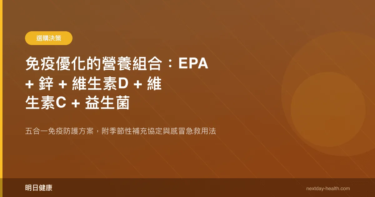 免疫優化不是「吃越多越好」,而是讓每個環節都不缺料。EPA 負責免疫調節、鋅守護先天免疫、維生素 D 管理適應性免疫、維生素 C 為免疫細胞供能、益生菌鞏固腸道防線。日常以基礎劑量維持,秋冬適度加強,感冒初期用鋅錠和維生素 C 做短期急救——這就是有證據支持的、務實的免疫營養策略。