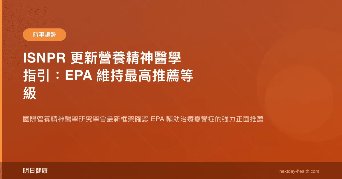 國際營養精神醫學研究學會(ISNPR)近期更新其臨床指引,在所有營養素輔助治療精神疾病的證據等級評估中,EPA 再度獲得「強力正面推薦(Strong Positive Recommendation)」,維持其在營養精神醫學領域的最高地位。這項更新基於 Sarris 等人開發的系統性證據評估框架,整合了過去十年間新增的隨機對照試驗與統合分析結果。