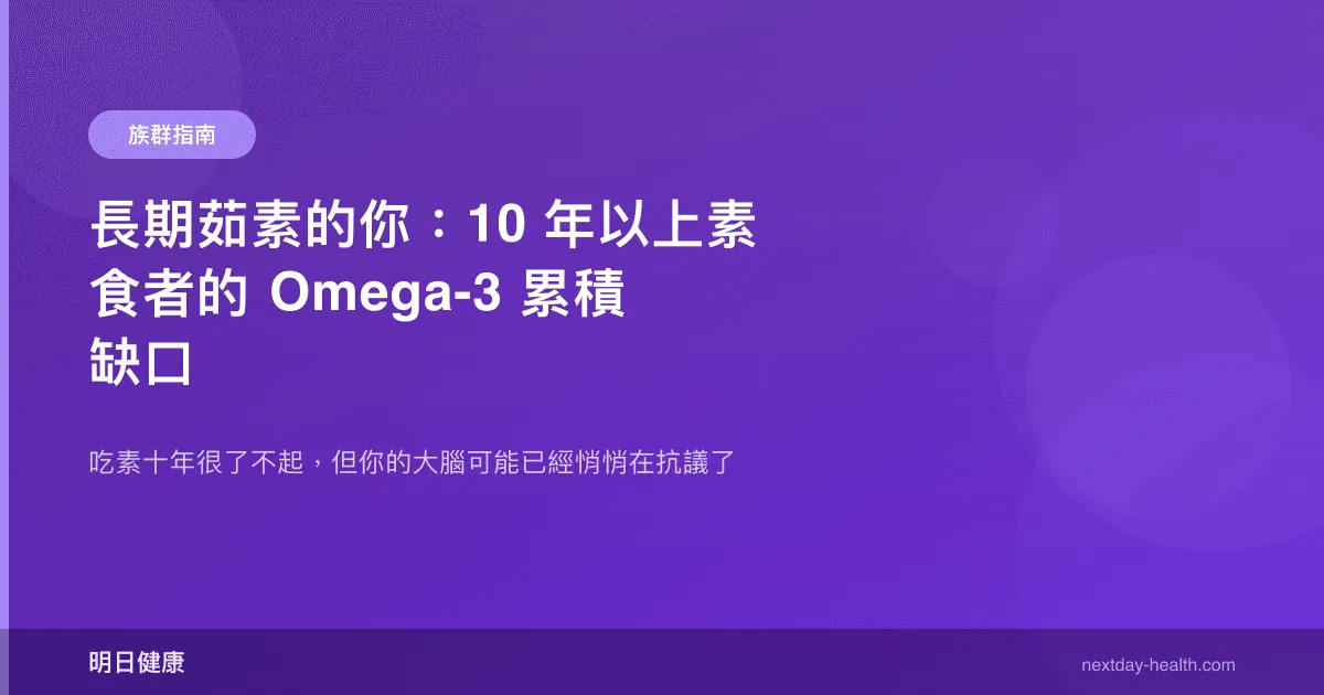 對於吃素超過五年的你,藻油不是一個「有了更好」的補充品——它是一個必需品。就像維生素 B12 對素食者是必需的一樣(因為植物性食物幾乎不含 B12),DHA 也是素食飲食中幾乎無法從食物獲得足夠量的營養素。