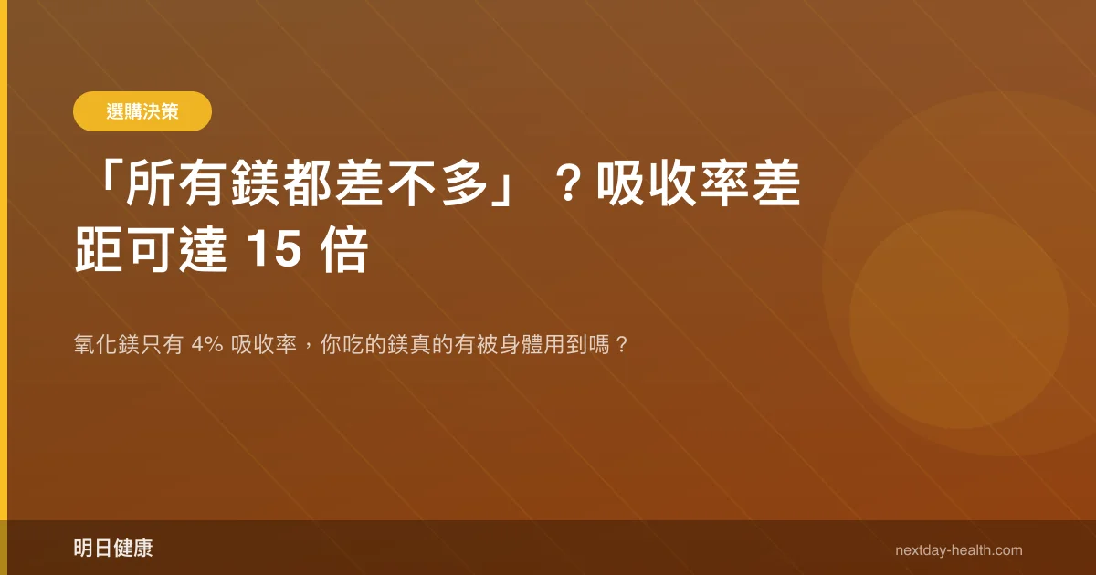 不一樣,差很多。2021 年系統性回顧顯示,檸檬酸鎂的吸收率約為氧化鎂的 24 倍,市面最常見的氧化鎂吸收率只有約 4%。同樣標示 400 mg,身體真正能用到的量天差地遠。