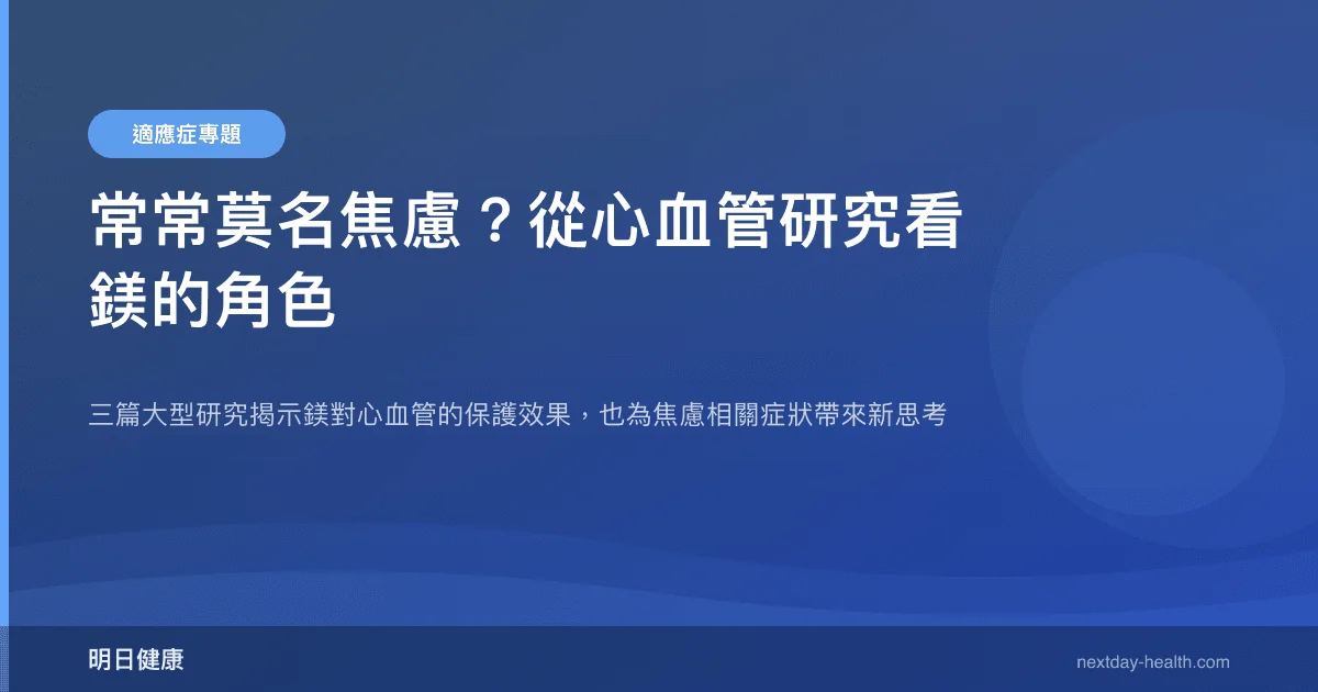 鎂是指人體內含量第四高的礦物質,參與超過 300 種酵素反應,從肌肉收縮、神經傳導到心臟節律都需要它。近年來,多項大型研究陸續揭示鎂與心血管健康的密切關係,而這些發現也為我們理解焦慮相關的身體症狀提供了新的角度。