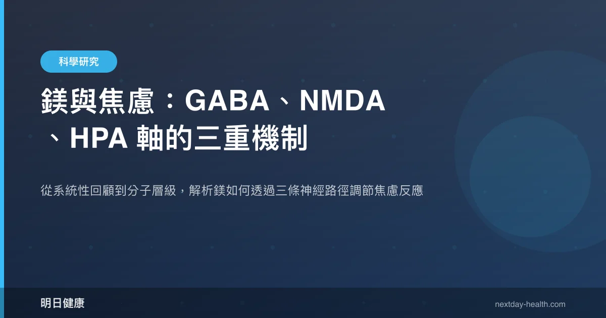 - 鎂透過三條路徑調節焦慮:增強 GABA 抑制性傳導、阻斷 NMDA 受體過度興奮、緩和 HPA 軸壓力反應。