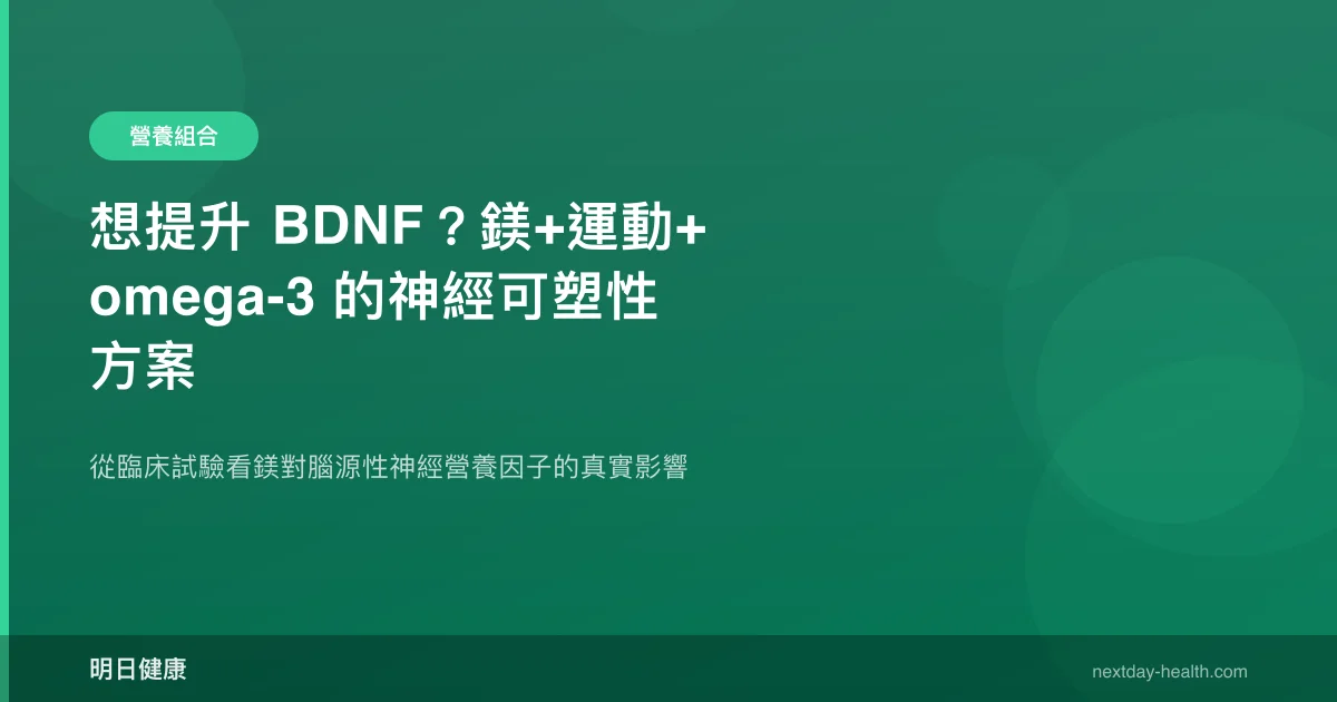 鎂補充可顯著改善憂鬱症狀(p=0.01),但對 BDNF 的直接提升效果仍存爭議——兩項隨機對照試驗呈現不同結論。腦源性神經營養因子(BDNF)是大腦可塑性的關鍵蛋白質,負責促進神經元生長、突觸連結與記憶形成。許多人希望透過營養策略提升 BDNF,而鎂、運動與 omega-3 的組合方案近年備受關注。本文整理現有臨床證據,釐清哪些策略有據可循、哪些仍需更多研究。