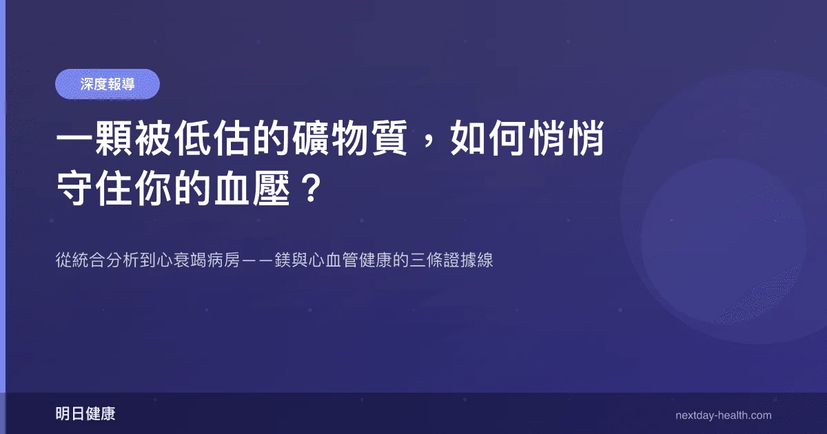我第一次注意到鎂這個礦物質,是在一份讓我意外的統合分析裡。那時我正在整理心血管營養素的文獻,原本以為鉀和鈉才是血壓的主角,但翻開 2025 年發表在《Hypertension》的大型統合分析,我發現鎂的角色遠比我想像的重要。