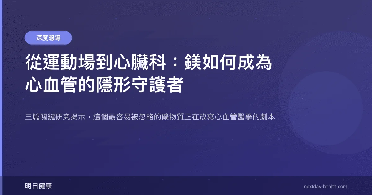 補充鎂可降低血壓、飲食鎂攝取與心血管存活率正相關、血清鎂濃度影響心衰竭藥物療效——這三條看似獨立的證據線,實際上交織出一幅完整的圖景。從預防端的血壓管理,到急性事件後的存活預測,再到藥物治療的療效優化,鎂在心血管健康的每一個階段都扮演著角色。