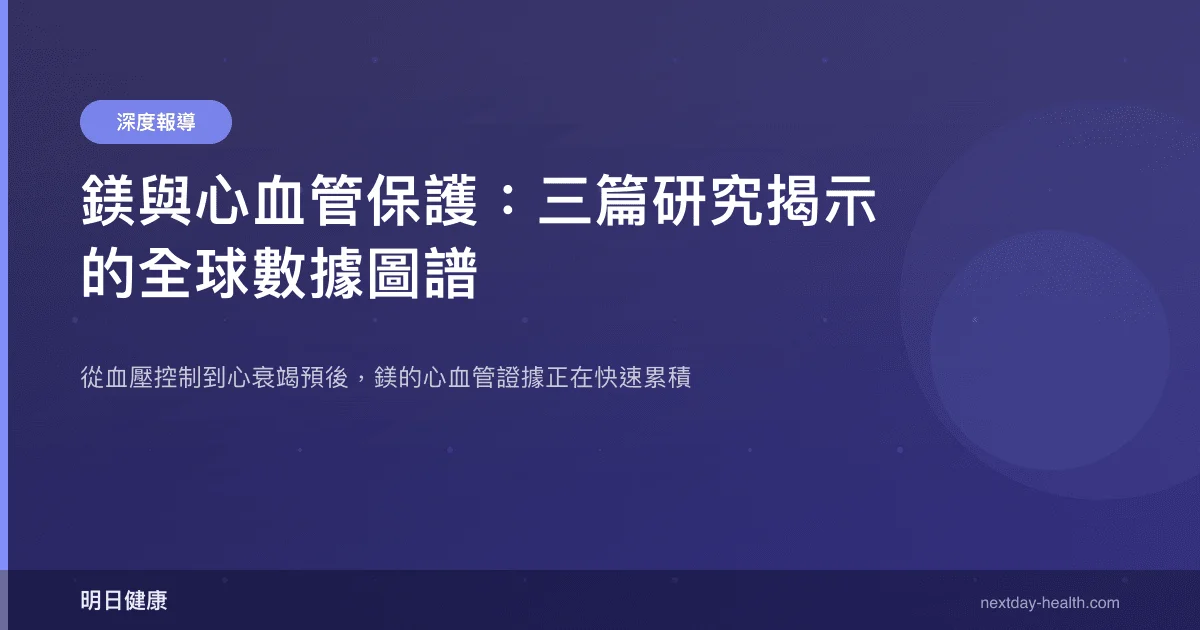 三篇研究分別從補充劑降壓(RCT 統合分析)、膳食攝取與死亡率(世代研究)、血清濃度與藥物交互作用(臨床試驗)三個維度,描繪了鎂的心血管保護潛力。證據的方向一致:鎂充足對心血管系統有益。