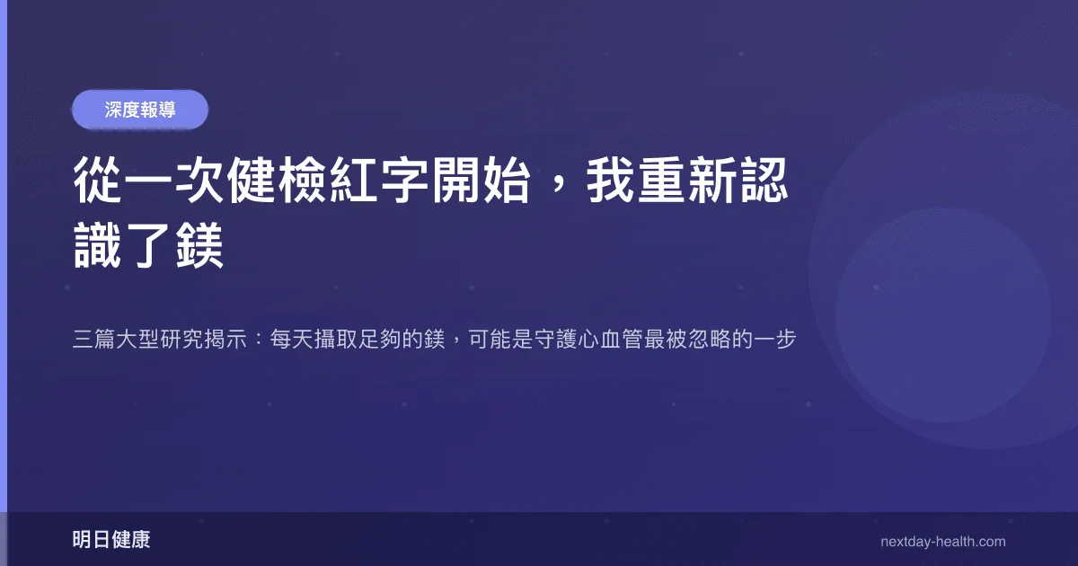 醫師在電話裡語氣平淡地建議我「調整飲食」,但沒說具體怎麼調。那天晚上,我開始翻查文獻,一個反覆出現的關鍵字抓住了我的注意力:鎂。這個國中化學課上學過的元素,竟然在心血管研究裡扮演著我從未想過的角色。接下來幾個月,我讀了大量研究,也開始重新審視自己的飲食。這篇文章,是我這段旅程的紀錄。