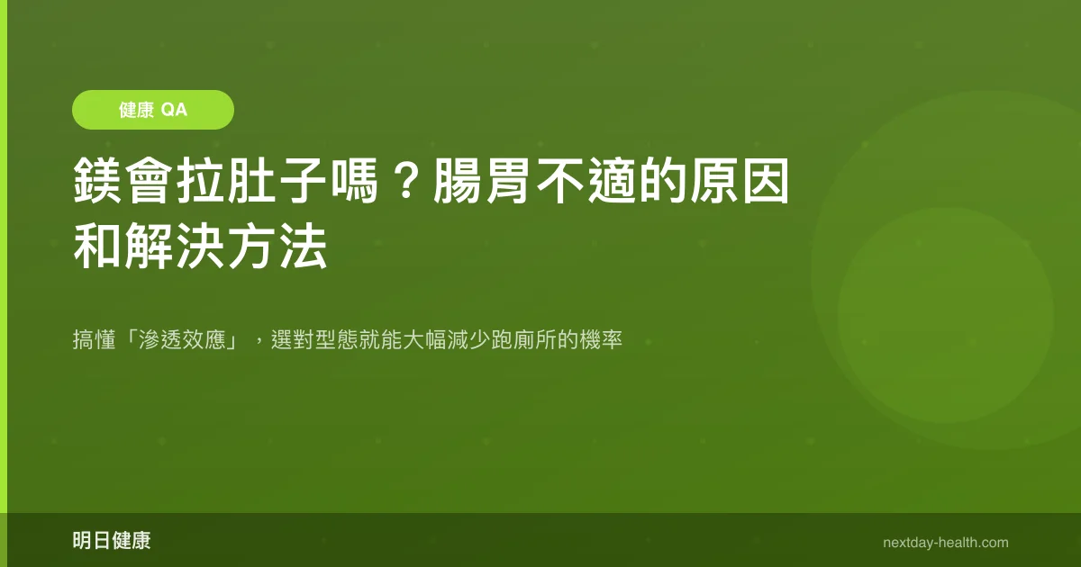 會,但要看你吃哪一種。研究顯示,鎂補充劑最常見的副作用就是輕度腹瀉,主因是未吸收的鎂在腸道產生「滲透效應」,把水分拉進腸腔,特別是氧化鎂和硫酸鎂最容易發生(Costello et al., 2023)。好消息是,換個型態或調整吃法,多數人都能避免。