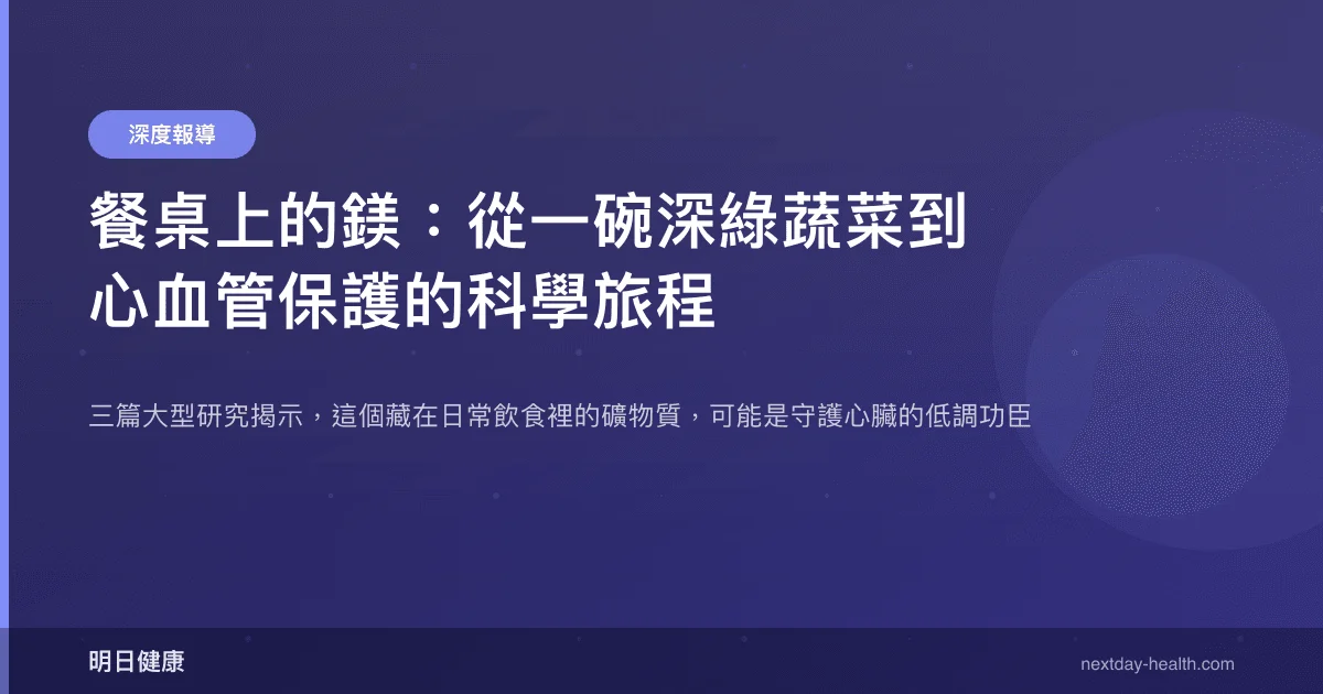 鎂(Magnesium)是人體內第四豐富的礦物質,參與超過 300 種酶促反應,從肌肉收縮、神經傳導到能量代謝都少不了它。傍晚的台灣家庭餐桌上,一盤炒菠菜、一碗糙米飯、幾顆腰果——這些再平凡不過的食物,其實都是鎂的重要來源。然而多數人並不知道,這個安靜存在於綠色蔬菜與全穀物中的礦物質,正成為心血管醫學研究的焦點。