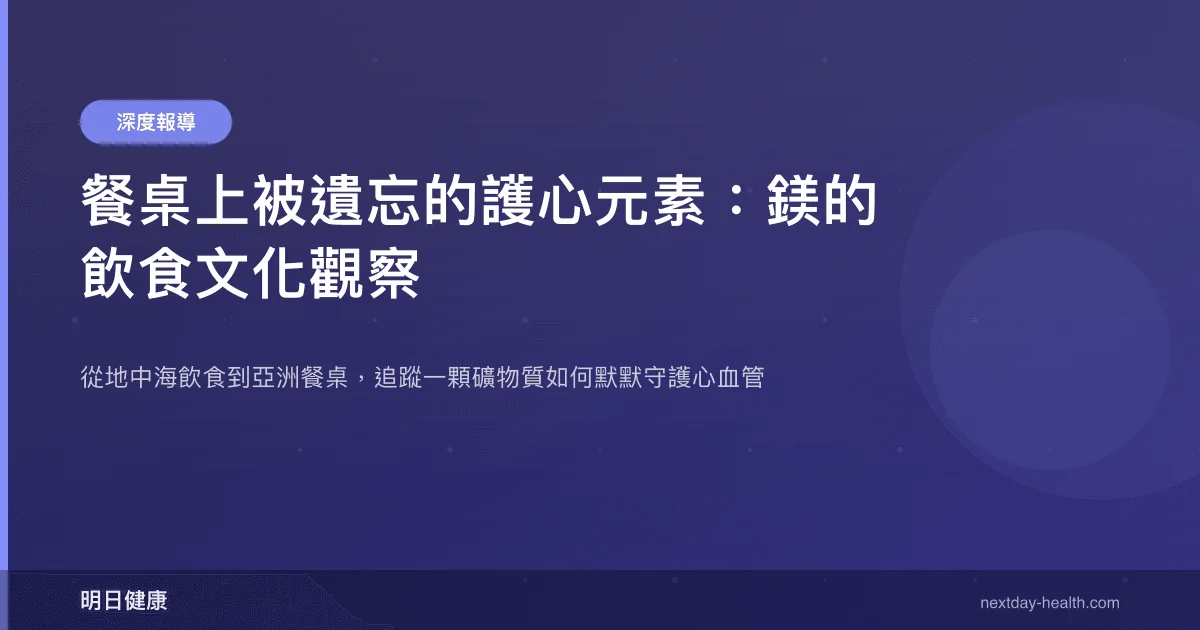 傍晚的台北街頭,一位剛下班的上班族走進自助餐店,夾了滷排骨、炒高麗菜、白飯,匆匆解決晚餐。幾條街外的地中海沿岸,一個希臘家庭正圍坐在橄欖木桌前,慢慢享用以菠菜、堅果和全穀物為主的晚餐。這兩張餐桌之間最大的差異之一,不是熱量,也不是蛋白質——而是一種常被忽視的礦物質:鎂。